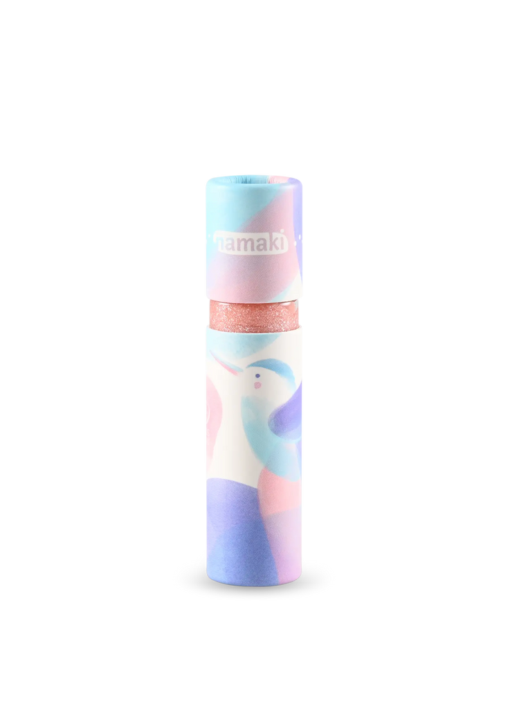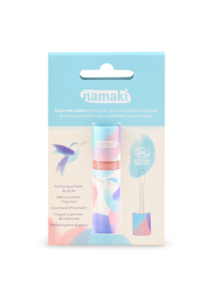This glittery pink lip gloss leaves lips soft, hydrated, and delicately shiny. Its sweet peach fragrance adds a delicious touch of fun to every smile. Specially crafted for children, its gentle formula lets their imagination shine freely. Enriched with organic oils, it nourishes and protects while giving the lips a subtle pink hue.