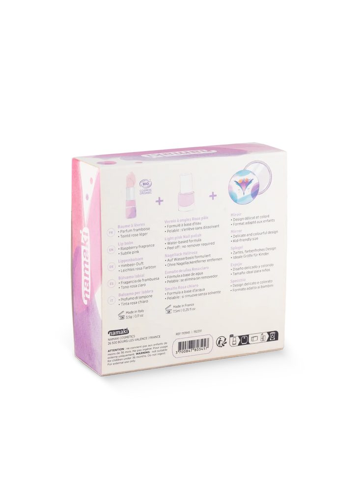This Nightingale set is perfect for adding a touch of pink to every moment of the day. It features three must-have products from our makeup range: a delicate pale pink nail polish, a raspberry-scented lip balm, and a charming owl-themed mirror you can take anywhere. Ideal for spoiling someone special, it’s the perfect gift for any occasion—Christmas, birthdays, or simply to offer a delightful surprise. This set combines playful beauty with gentle care for children’s skin.