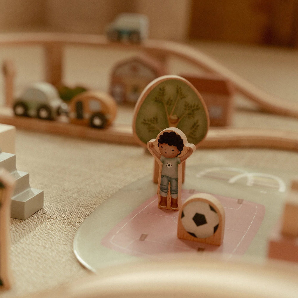 Go on endless adventures with the Little Dutch wooden railway track. Hop on board the train, the bus, the taxi or the car and explore the town. With more than 100 parts, this set offers many options to get creative and build new combinations over and over again. Features a locomotive with three cars, straight rails, curves, a bridge, various buildings, cars, people, trees, flower boxes, road signs, lamp post, traffic light, bus, ice cream truck, dog and a bicycle. Each of the wooden figurines and elements has detailed illustrations on both sides. Additional playsets, such as vehicles, a zoo and a garage, are available for even more hours of fun play.